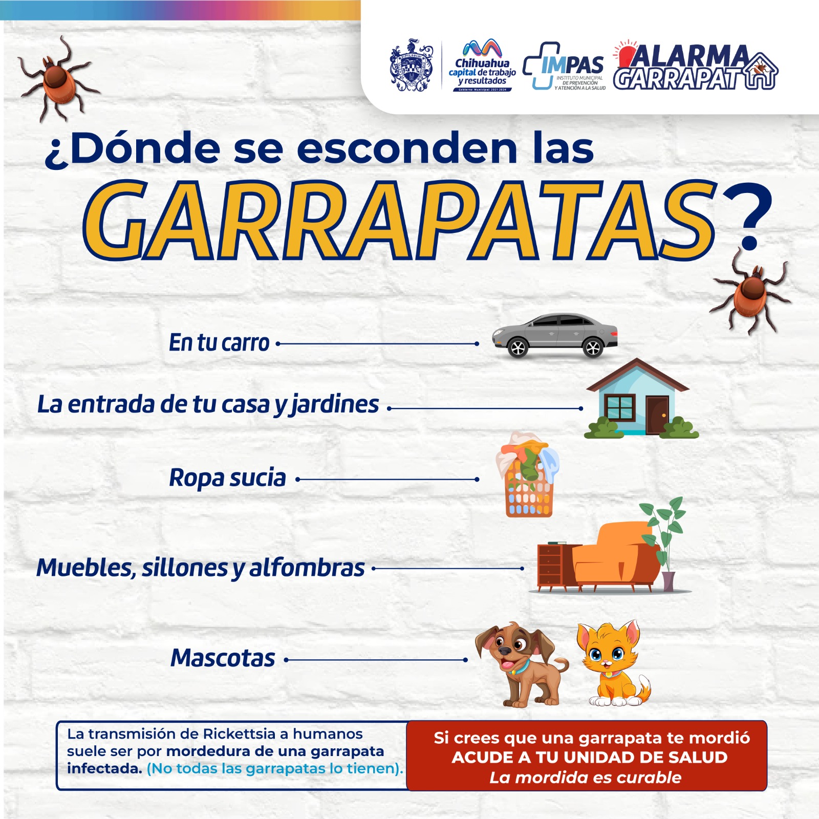 Chihuahua, Chih. A 16 de julio de 2024.- El Gobierno Municipal de Chihuahua a través del Instituto Municipal de Prevención y Atención a la Salud (IMPAS), le recuerda a la ciudadanía la importancia de mantener sus hogares limpios para prevenir la aparición de la garrapata, que pudiera provocar contagios de rickettsia.