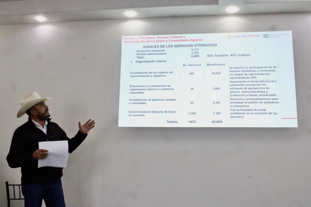 Chihuahua, con una extensión de 247,000 kilómetros cuadrados, enfrenta desafíos únicos debido a su diversidad ecológica, que incluye zonas desérticas, agropecuarias y forestales. Actualmente, el 40% de su territorio es propiedad social, distribuida en 989 núcleos agrarios, de los cuales 916 son ejidos y 73 son comunidades indígenas, principalmente del pueblo Rarámuri, así como grupos Otomíes, Tepehuanos del Norte y Guarijíos. La Procuraduría Agraria, en colaboración con el Registro Agrario Nacional, ha trabajado intensamente en la actualización de padrones ejidales y comunales, beneficiando a 4,383 ejidatarios y comuneros en el último año. Además, se han realizado 1,475 servicios de asesoría y actualización, impactando a 43,665 personas en todo el estado.
