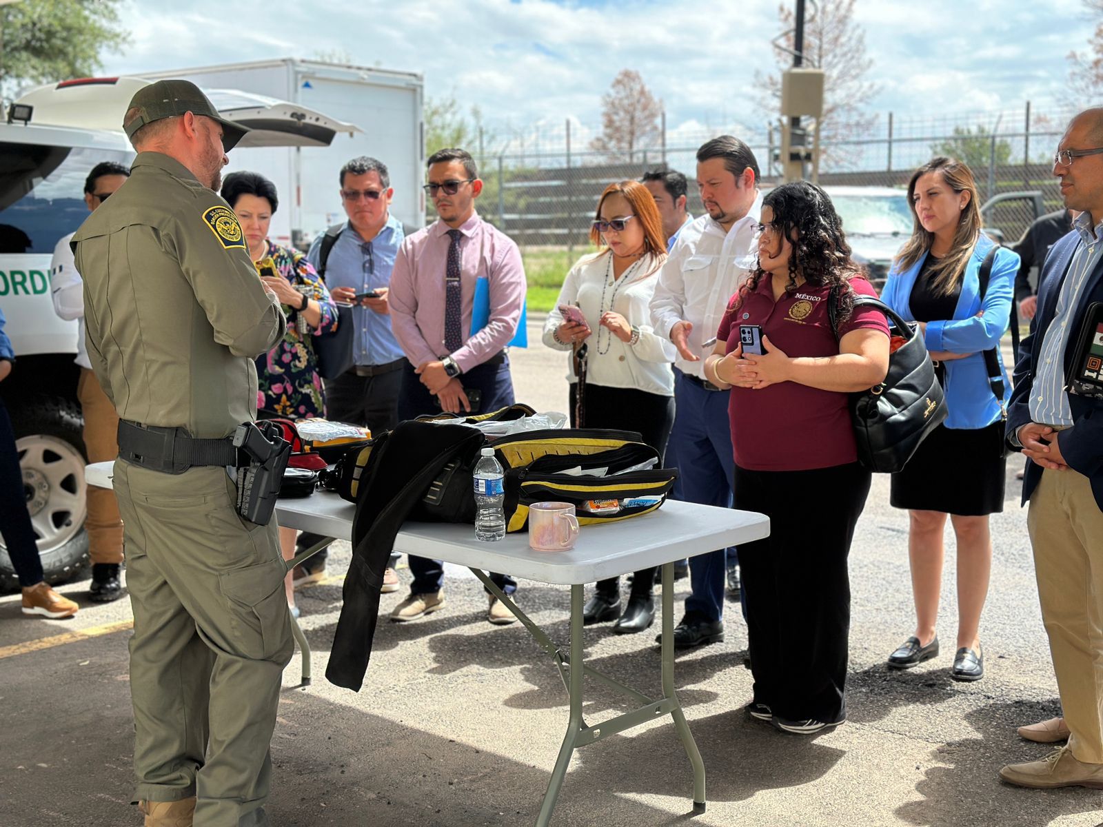 Durante el encuentro, se realizó una demostración sobre las capacidades tecnológicas de rescate de la Patrulla Fronteriza, que incluye el uso de botones de pánico ubicados en zonas desérticas y las rutas que recorren los migrantes a pie durante hasta dos semanas tras cruzar el bordo.