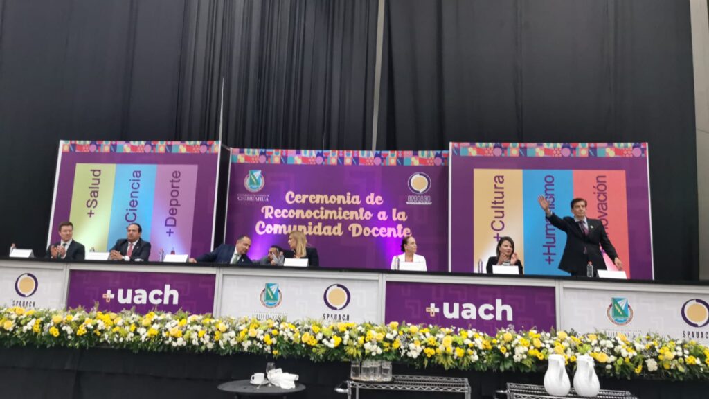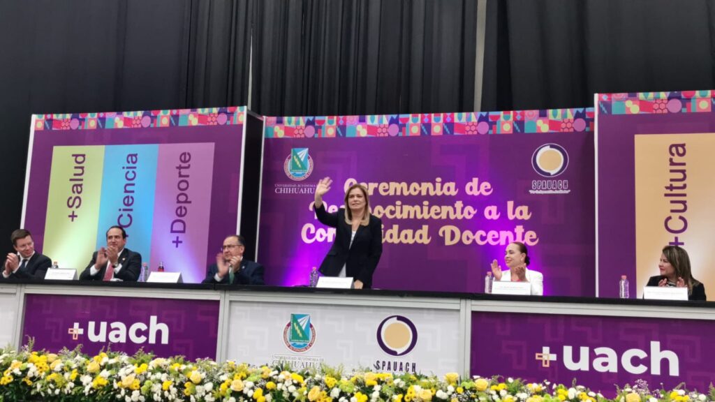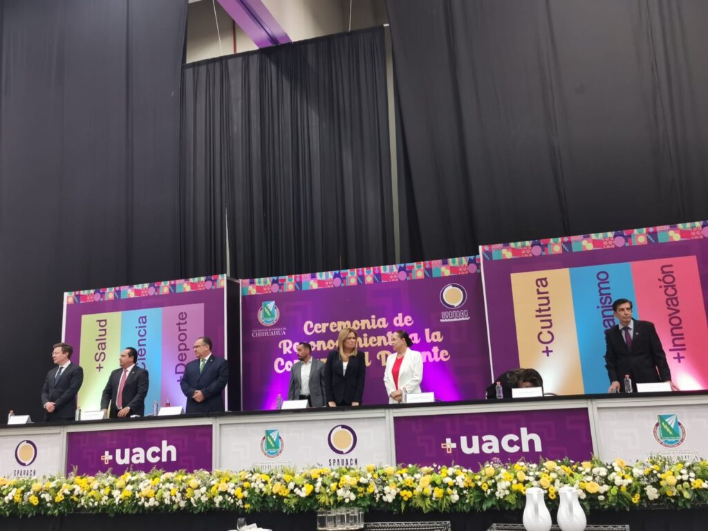 Esta mañana, se llevó a cabo la Ceremonia de reconocimiento a la comunidad docente de la Universidad Autónoma de Chihuahua (UACh), misma que fue encabezada por la gobernadora María Eugenia Campos Galván y el rector Luis Alfonso Rivera Campos.