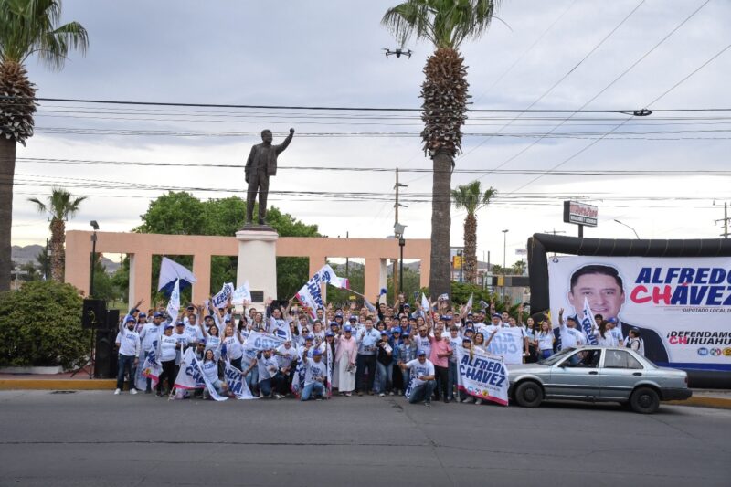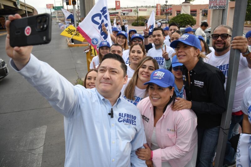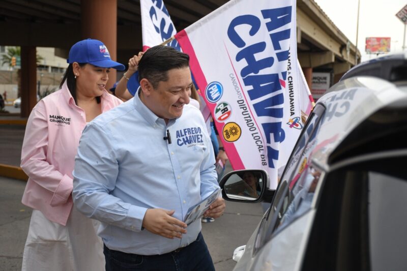 Chihuahua, Chih.- Como parte de las actividades de campaña, el candidato por el Distrito 18 por la coalición Juntos Defendamos a Chihuahua, Alfredo Chávez, estuvo junto a su equipo en el crucero del Periférico de la Juventud y Francisco Villa, para solicitar el apoyo de los automovilistas este próximo 2 de junio, junto a la candidata por el Distrito 06 Federal Manque Granados y su fórmula, Ale Enríquez.