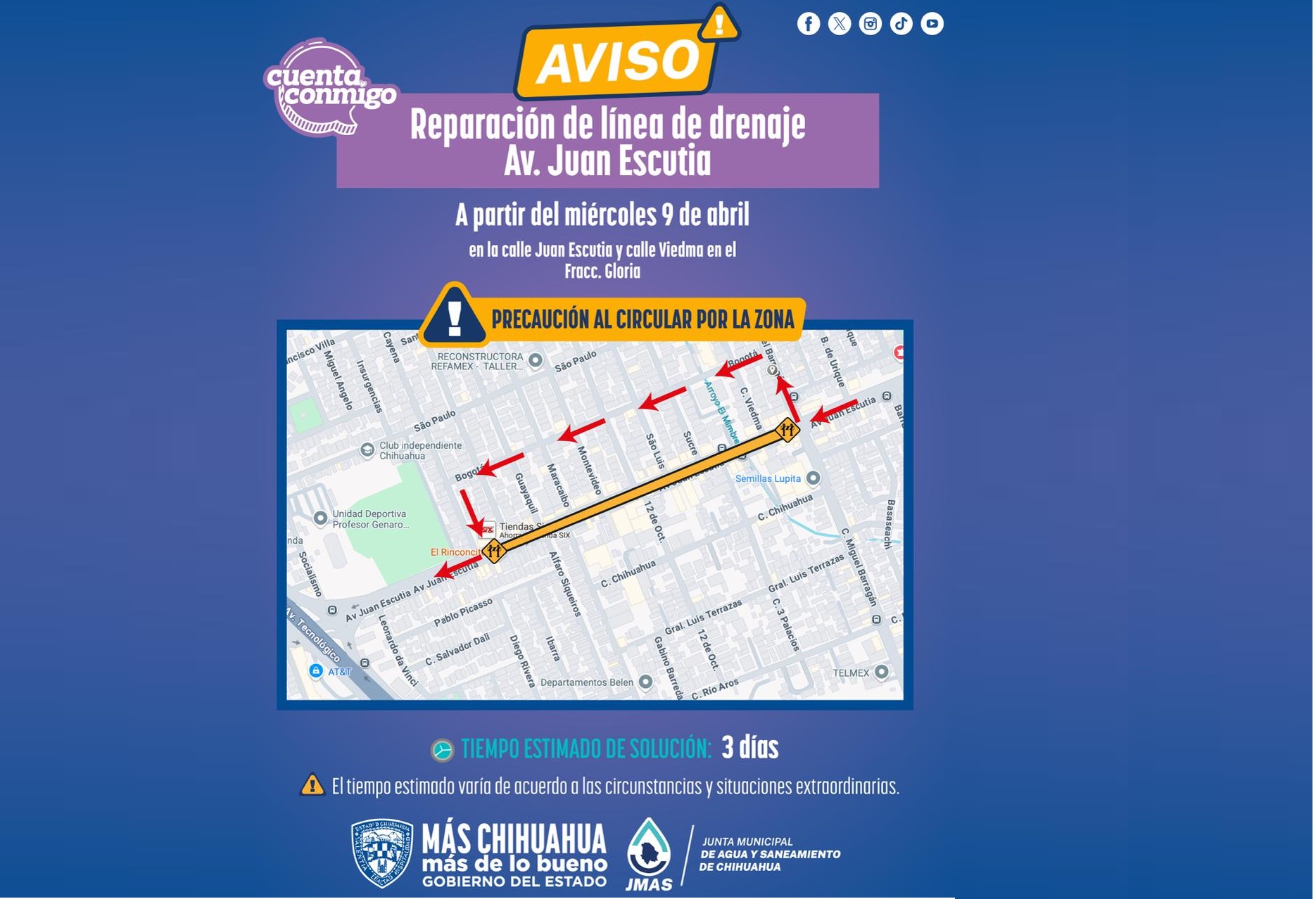 La Junta Municipal de Agua y Saneamiento (JMAS) de Chihuahua, inició con los trabajos de reparación de una línea de drenaje, en el cruce de la avenida Juan Escutia y la calle Viedma.