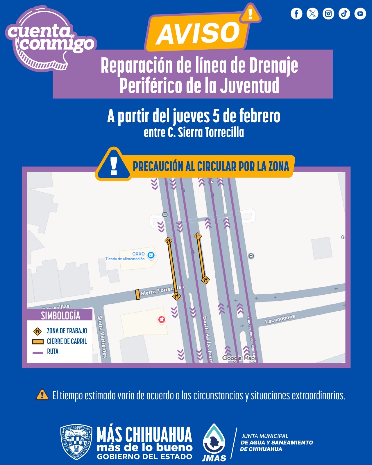 La Junta Municipal de Agua y Saneamiento de Chihuahua comenzará el jueves 5 de febrero, los trabajos de reparación de un tramo de línea de drenaje en el periférico De la Juventud y Sierra Torrecillas, afectado por excavaciones a cargo de un contratista de la Comisión Federal de Electricidad (CFE).