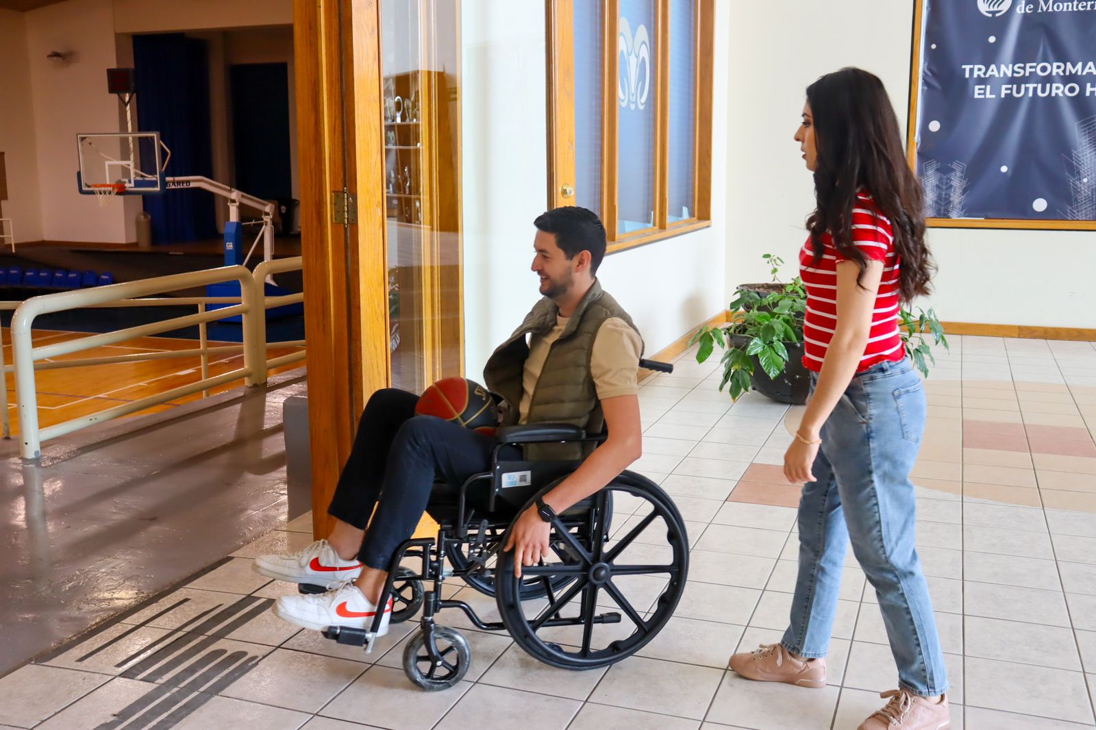 Como parte del taller de sensibilización, las y los integrantes de la comunidad escolar se desplazaron en sillas de ruedas y bastón guía para invidentes, para constatar la importancia de que los inmuebles cuenten con instalaciones accesibles para quienes tienen alguna limitación visual o motriz.