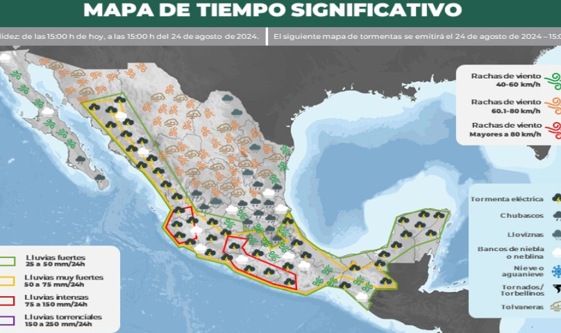 De acuerdo al Servicio Meteorológico Nacional de CONAGUA, este sábado, se pronostica una máxima de 34°C, y una mínima de 22°C, con cielo mayormente soleado, para el domingo se espera una máxima de 33°C y una mínima de 21°C, con cielo soleado.