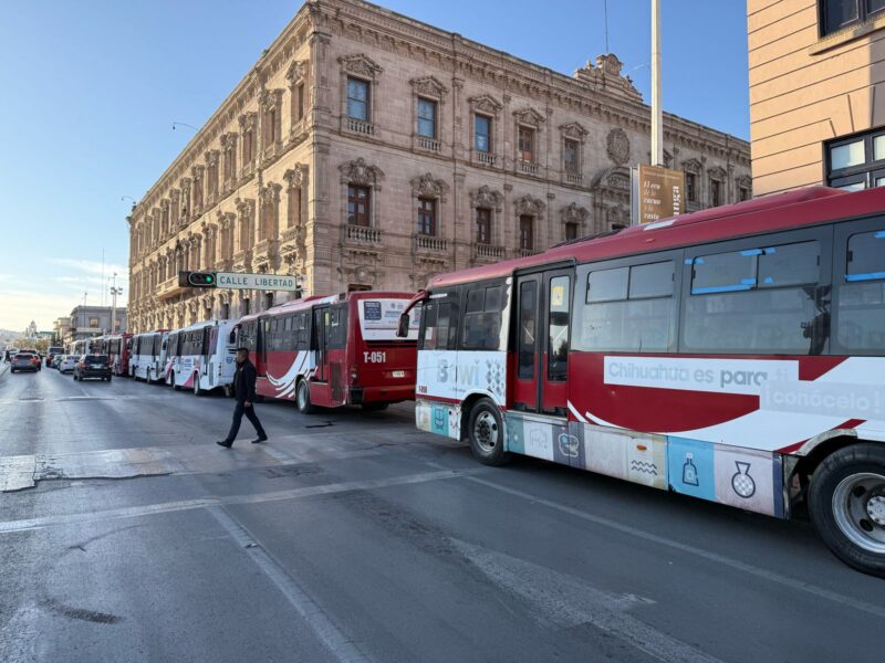 Chihuahua a 28 de febrero.- La mañana de este viernes, el Palacio de Gobierno amaneció rodeado por unidades del transporte público Bowi, luego de que sus choferes se manifestaran en exigencia de mejores condiciones laborales.