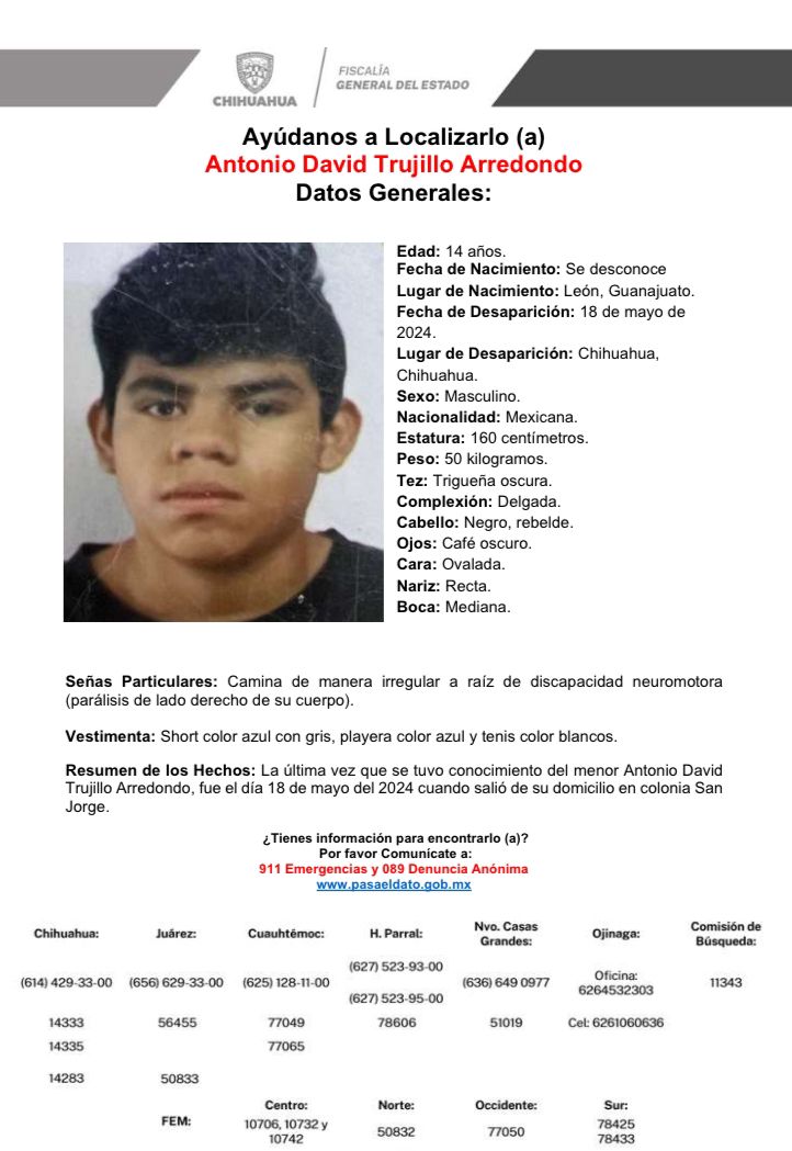 El adolescente de 14 años de edad se extravió desde el pasado sábado 18 de mayo, cuando salió de su domicilio en colonia San Jorge, en la ciudad de Chihuahua.