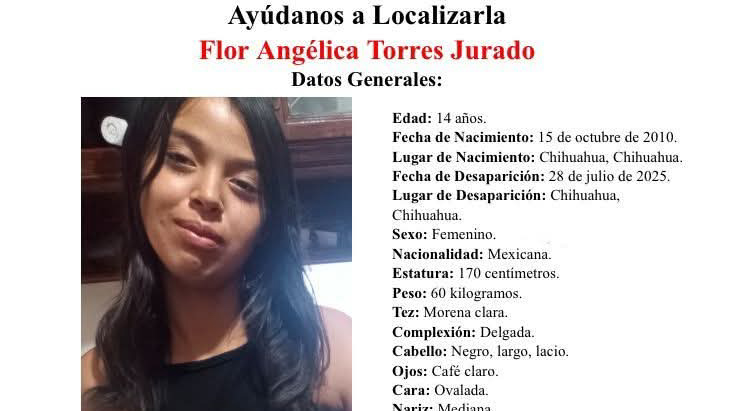 Flor Angélica Torres Jurado, de 14 años de edad, desapareció el lunes 28 de julio, luego de ser vista por última vez en el fraccionamiento Jardines de San Agustín, al suroriente de la ciudad de Chihuahua.
