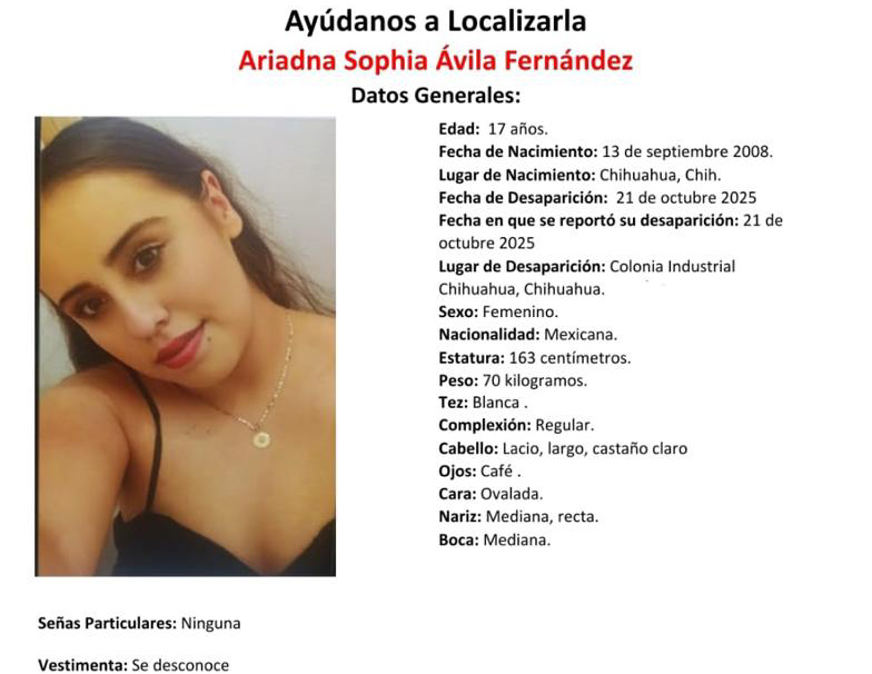 La Fiscalía General del Estado publicó la pesquisa de Ariadna Sophia Ávila Fernández, de 17 años de edad, quien desapareció en la colonia Industrial.