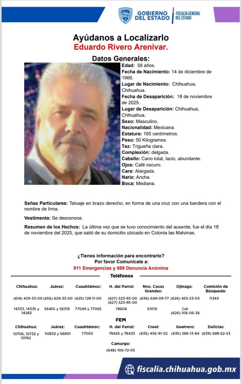 El ciudadano Eduardo Rivero de 58 años, desapareció en la colonia Malvinas, al surponiente de la ciudad de Chihuahua, el pasado 18 de noviembre.