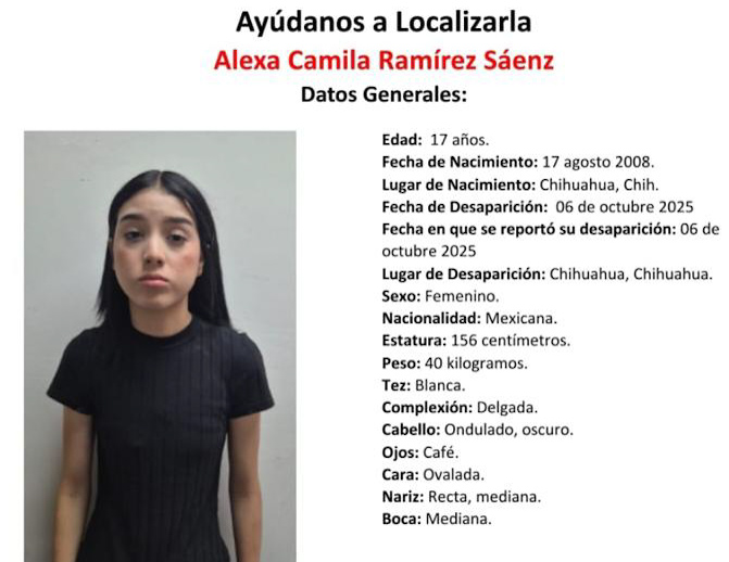 Alexa Camila Ramírez Sáenz, de 17 años de edad, fue reportada como desaparecida este lunes 6 de octubre, luego de ser vista por última vez en la colonia Libertad, en la ciudad de Chihuahua.