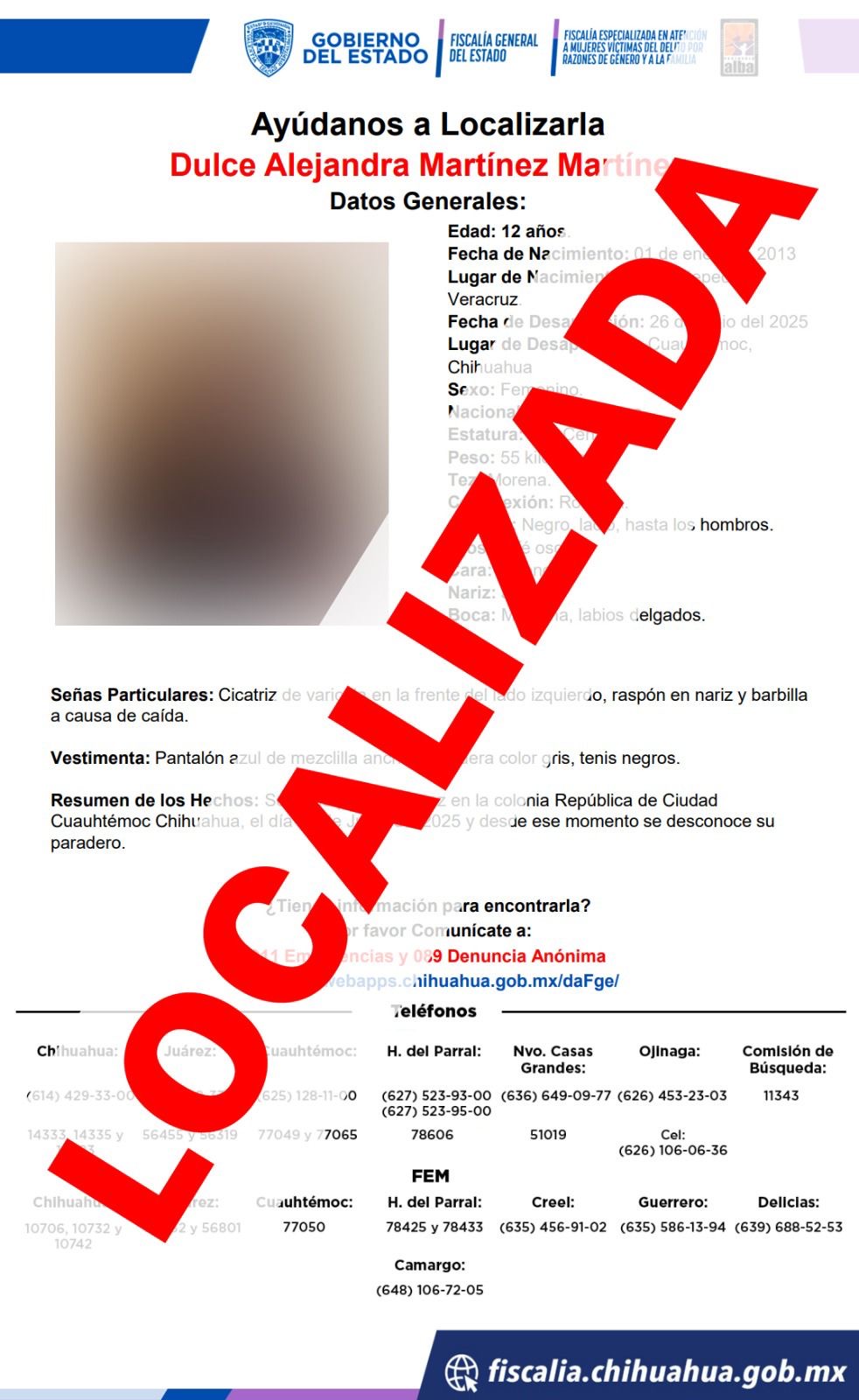 Los agentes ministeriales encargados de las labores de búsqueda, localizaron a la menor de 12 años de edad, en el domicilio de unos familiares ubicado en la colonia Reforma de la ciudad de Cuauhtémoc.