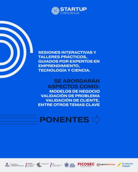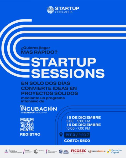 Startup Sessions nace del trabajo conjunto entre el Gobierno del Estado, el Gobierno Muncipal, el Instituto de Innovación y Competiitividad, Fundación Coppel, Emprendemos A.C., el Tecnológico de Monterrey y Startup Chihuahua.