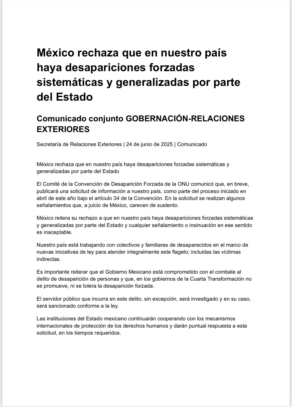 Ciudad de México, 25 de junio de 2025. El Gobierno de México rechazó categóricamente los señalamientos del Comité contra la Desaparición Forzada de la ONU, que activó el procedimiento del artículo 34 de la Convención Internacional para la Protección de Todas las Personas contra las Desapariciones Forzadas. Según el Comité, existen indicios de desapariciones forzadas sistemáticas y generalizadas en el país.