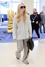 La actriz prefirió la comodidad, luciendo una camisa muy suelta de rayas verticales y lo complemento con unos pantalones anchos en tono gris. Ella utilizó bolso de acabado trenzado de Bottega Veneta.