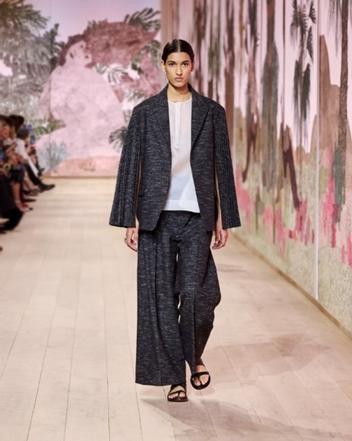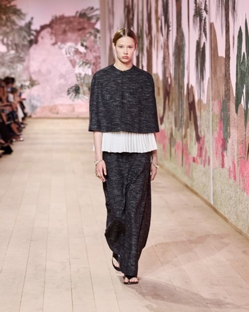 El desfile presento vestidos largos de lana blanca y capas a juego, con pliegues que evocan las estatuas clásicas de la antigüedad, incorporo también colores como: beige, negro, dorado y planteado con sandalias planas que añaden un toque más a la autenticidad de aquellos años.