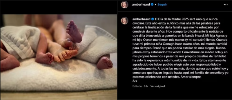 La actriz Amber Heard anunció con emoción la llegada de sus hijos mellizos, Agnes y Ocean, a través de una publicación en su cuenta de Instagram este domingo 11 de mayo. En la imagen, que muestra los diminutos pies de los recién nacidos, expresó su felicidad por ver realizada la familia que tanto había soñado construir. “Estoy más feliz de lo que las palabras pueden expresar”, escribió, acompañando el mensaje con un emotivo reconocimiento a este Día de la Madre 2025, que calificó como inolvidable.