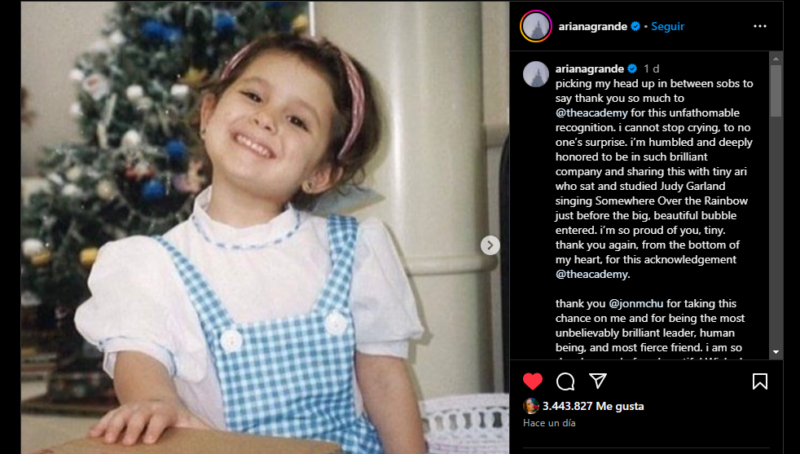 En sus redes sociales, Ariana también agradeció a la Academia con una emotiva publicación. Compartió fotos de su infancia vestida como Dorothy de El Mago de Oz y dedicó palabras a su versión más joven: “Me siento profundamente honrada de estar en tan brillante compañía. Este logro es para la pequeña Ari que soñaba con momentos como este.” Además, reconoció el trabajo de Jon M. Chu, destacando su liderazgo y amistad durante el proyecto.