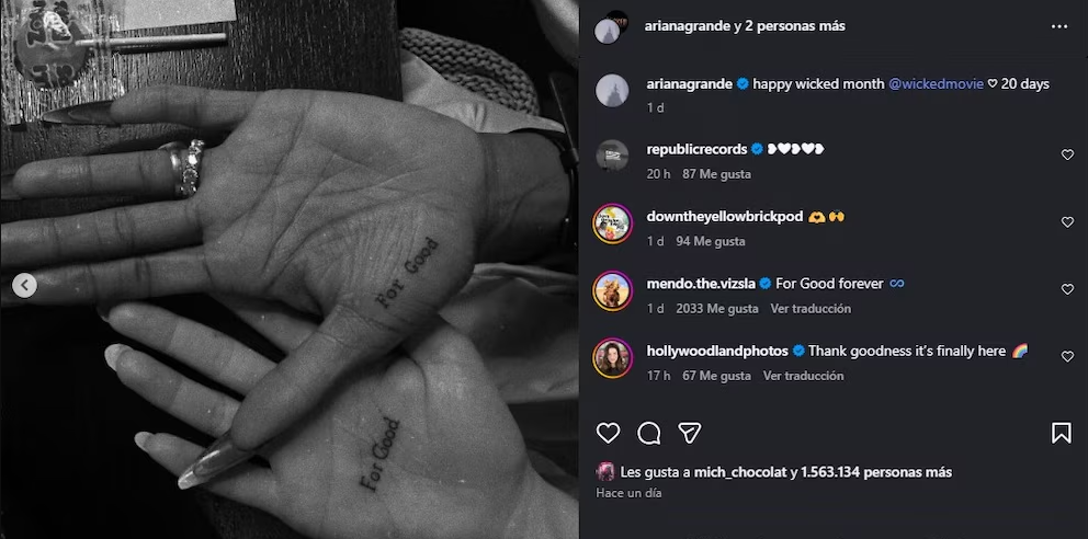 Las estrellas Ariana Grande y Cynthia Erivo celebraron su duradera amistad y el inminente estreno de Wicked: For Good con un gesto simbólico y permanente: un tatuaje compartido con la frase “For Good”, el mismo título de la esperada secuela del exitoso musical. Ambas artistas, que protagonizan la producción dirigida por Jon M. Chu, mostraron orgullosamente el diseño en la palma de sus manos a través de una publicación en Instagram, donde también compartieron fotos del rodaje.