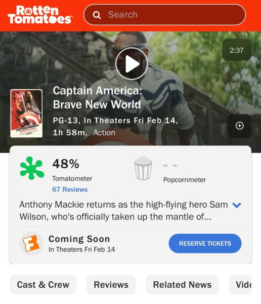 Pese a las expectativas, la película obtuvo un 54% de aprobación en Rotten Tomatoes, convirtiéndose en la entrega peor valorada de la saga de Capitán América y una de las más bajas en el UCM. Anteriormente, Eternals (47%) y Ant-Man: Quantumania (46%) habían sido duramente criticadas, pero lograron buenos resultados en taquilla. Ahora, queda por ver si el público será más benévolo con esta nueva entrega o si confirmará su fracaso.