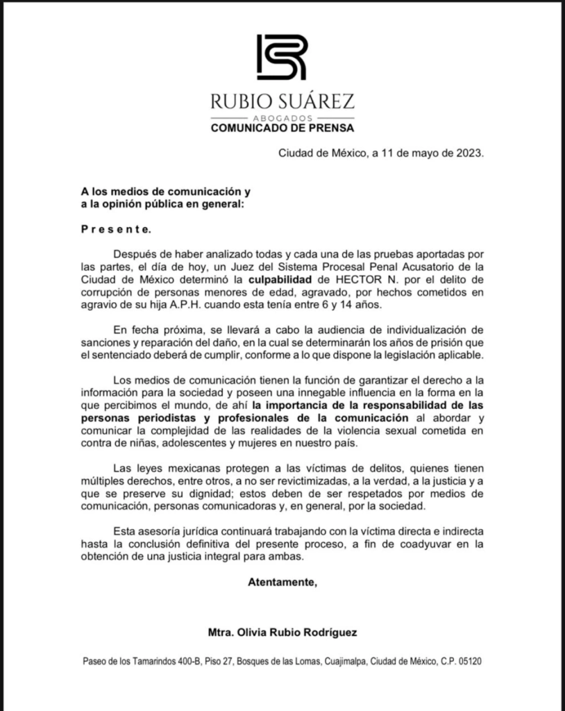 A través de un comunicado de prensa, se informo y confirmo la sentencia de Héctor N:
