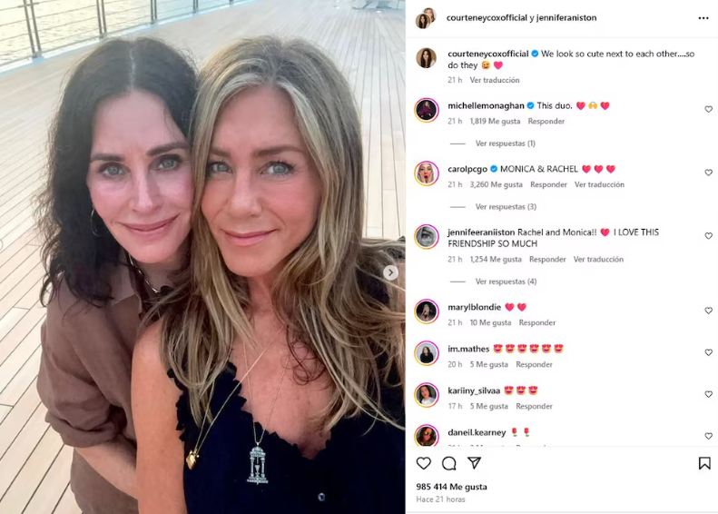 La imagen fue publicada el 17 de agosto y mostró a Aniston con un top negro sin mangas y a Cox con una camiseta marrón, ambas sonriendo frente a la cámara. El texto que acompañó la fotografía decía: “Qué lindas nos vemos juntas… ellas también”, en alusión a los productos de belleza de sus propias marcas que aparecieron en la publicación. Los seguidores celebraron con entusiasmo el reencuentro digital, resaltando la complicidad que ambas conservan.