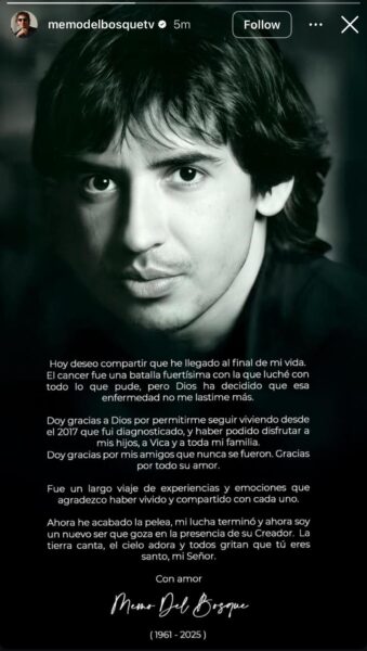 Sus colegas, amigos y familiares expresaron su cariño y admiración al recordarlo como una figura entrañable dentro del mundo del espectáculo. A través de una publicación en su cuenta de Instagram, el propio Memo anunció su despedida de este mundo con un emotivo mensaje donde agradeció a Dios, su familia y amigos por acompañarlo en su proceso y expresó haber llegado al final de su camino con serenidad.
