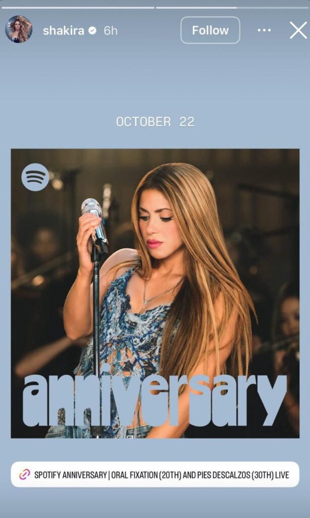 Shakira conmemora sus 30 años de carrera y dos de sus discos más emblemáticos con un EP en vivo exclusivo para Spotify, donde reinterpretará algunos de sus mayores éxitos. Este lanzamiento celebra los aniversarios de Pies Descalzos (1995), el álbum que la llevó a la fama internacional, y Oral Fixation Vol. 1 & 2 (2005), que consolidó su proyección global con temas en inglés y español.