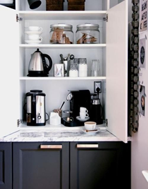 Si eres de esas personas que no les gusta mostrar los electrodomésticos una alternativa sería trabajar en conjunto con el mobiliario de la cocina una estantería extra, de esta manera tu coffee bar, estará oculta y lista para cuando desees.
