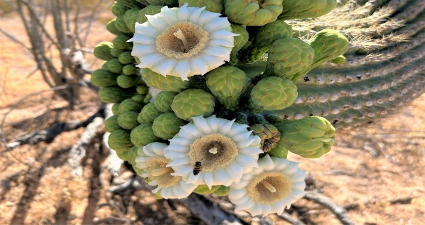 También conocida como “Saguaro”, es un cactus de lento crecimiento y puede alcanzar los 16 a 18 metros de altura. De joven tiene espinas largas y afiladas, pero en su adultez tienden a perderlas. La floración de los saguaros se da al superar los 4 metros de altura, y lo hacen en la parte superior de cada tallo. Su color es blanco y pueden medir hasta 13 centímetros de diámetro.
