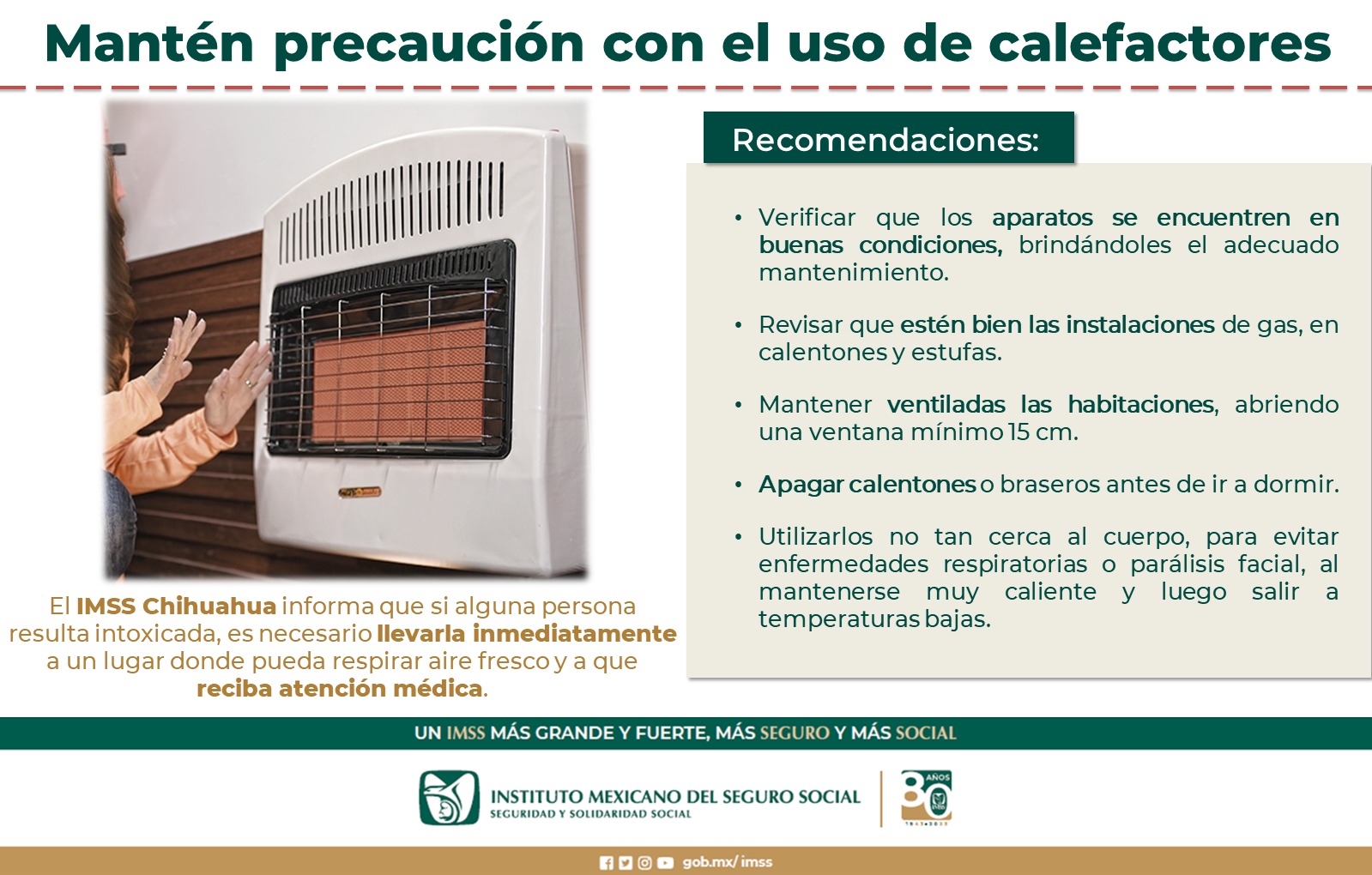 Ante la presencia de las bajas temperaturas en la entidad, el Instituto Mexicano del Seguro Social (IMSS) en Chihuahua, exhorta a la ciudadanía para que extremen cuidados con los calentones, ya que un mal uso de los mismos podría causar una intoxicación en quienes habiten la vivienda.
