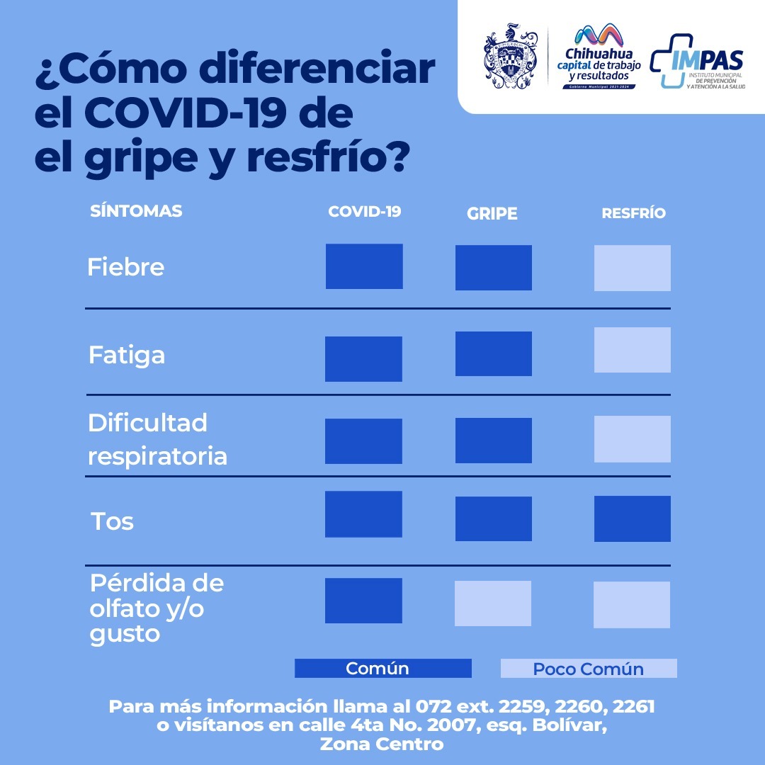 Chihuahua, Chih. A 9 de diciembre 2023.- Con el objetivo de proteger la salud de las familias de la capital durante esta temporada, el Gobierno Municipal de Chihuahua, a través del el Instituto Municipal de Prevención y Atención a la Salud (IMPAS), comparte los síntomas y signos comunes que nos permiten identificar enfermedades respiratorias como: el resfrío general, influenza y COVID.