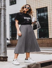 Otra forma de llevar tus tenis blancos es, con una falda plisada, ya sea un largo midi o hasta la rodilla, en colores suaves o metálicos, lograras crear un contraste interesante con la simplicidad.