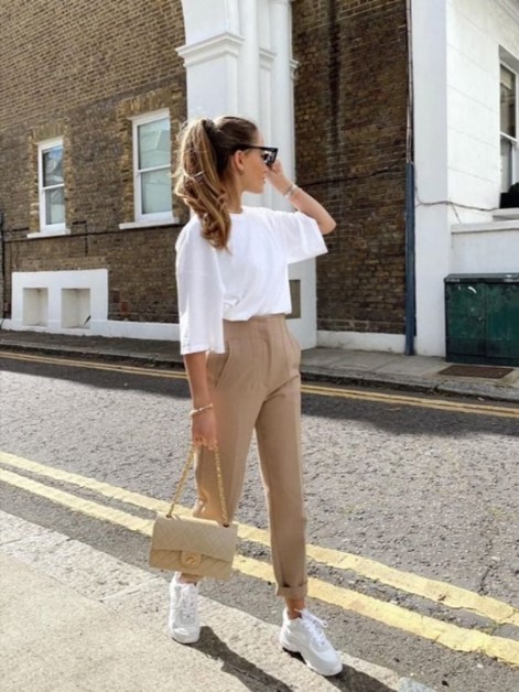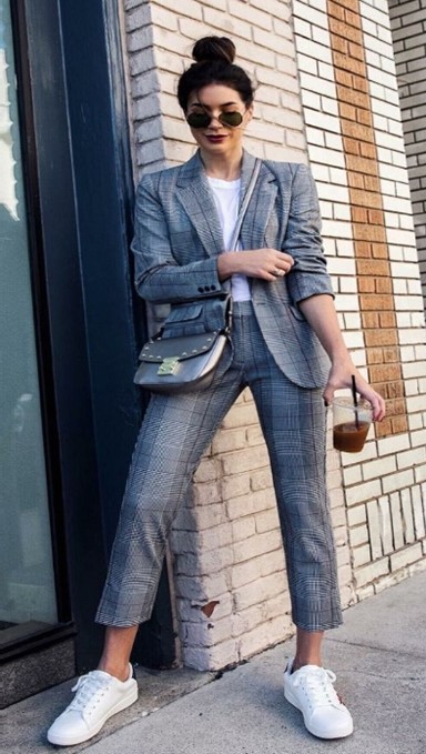 Ahora si requieres una opción más sofisticada y sería, la opción es que combines tus tenis blancos con un traje sastre de colores neutros, ya sea beige, gris claro o azul marino.