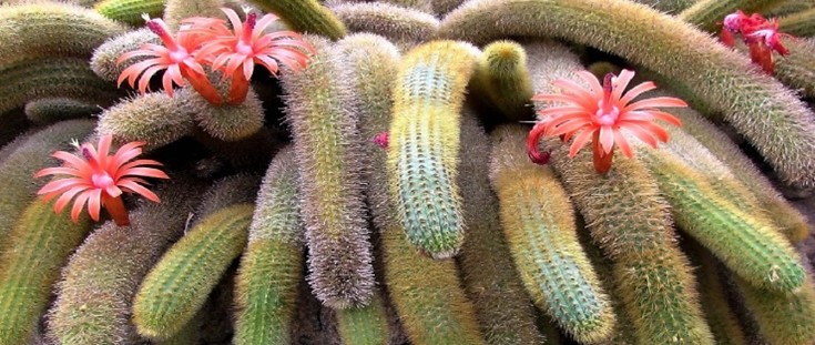 El nombre científico de esta exuberante planta es Cleistocactus colademononis, también conocida como “cola de gato”. Es una planta originaria de Bolivia y una de las características principales de este cactus son sus largos, peludos y circulares tallos colgantes que precisamente son los que le dan el nombre de “Cola de Mono”, también se deben destacar sus impresionantes y bellas flores rojizas, estas florecen a finales de la primavera y principios del verano.