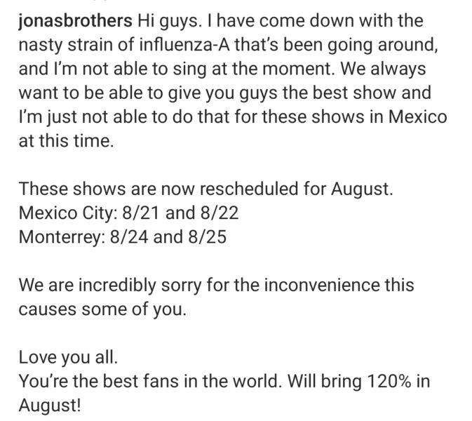 El día de hoy a través de la cuenta oficial de Instagram de la banda Jonas Brothers, Nick anunció la lamentable noticia de que analizarán sus conciertos en México hasta agosto de este mismo año, por lo que no será posible verlos en la Ciudad de México y Monterrey hasta ese mes.