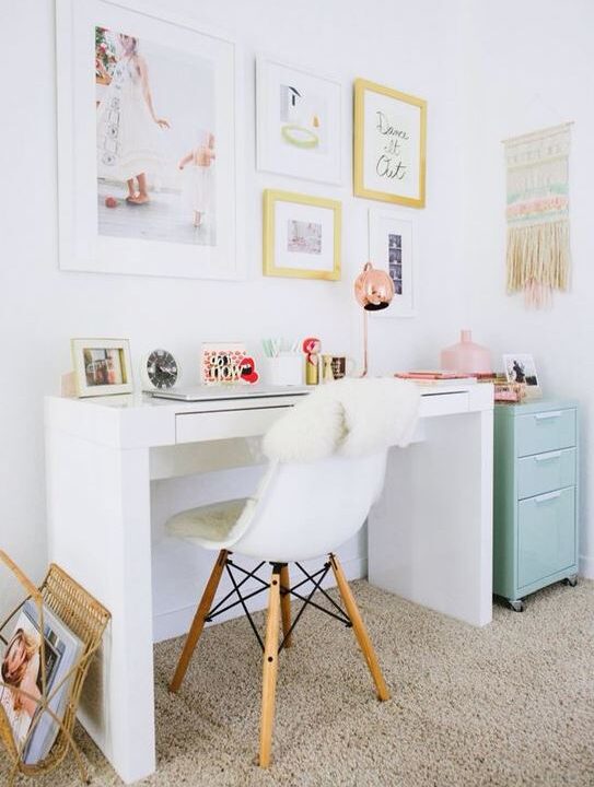 Para la silla, lo más importante es que sea cómoda y ergonómica, que se adapte a nuestra postura y nos brinde soporte lumbar. Podemos elegir una silla pequeña pero confortable, que tenga ruedas para facilitar el movimiento y un diseño minimalista que no recargue el ambiente.