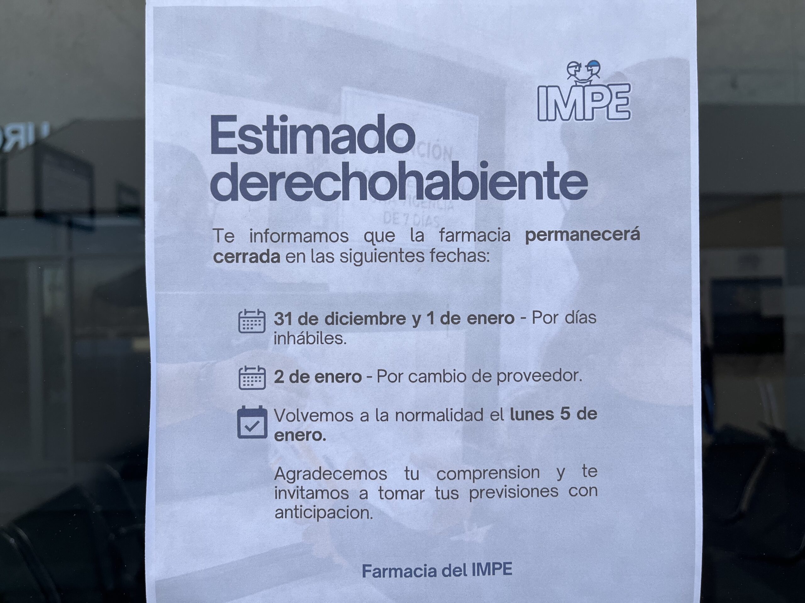 Abrirá farmacia del IMPE hasta el 5 de enero por días inhábiles y cambio de proveedores