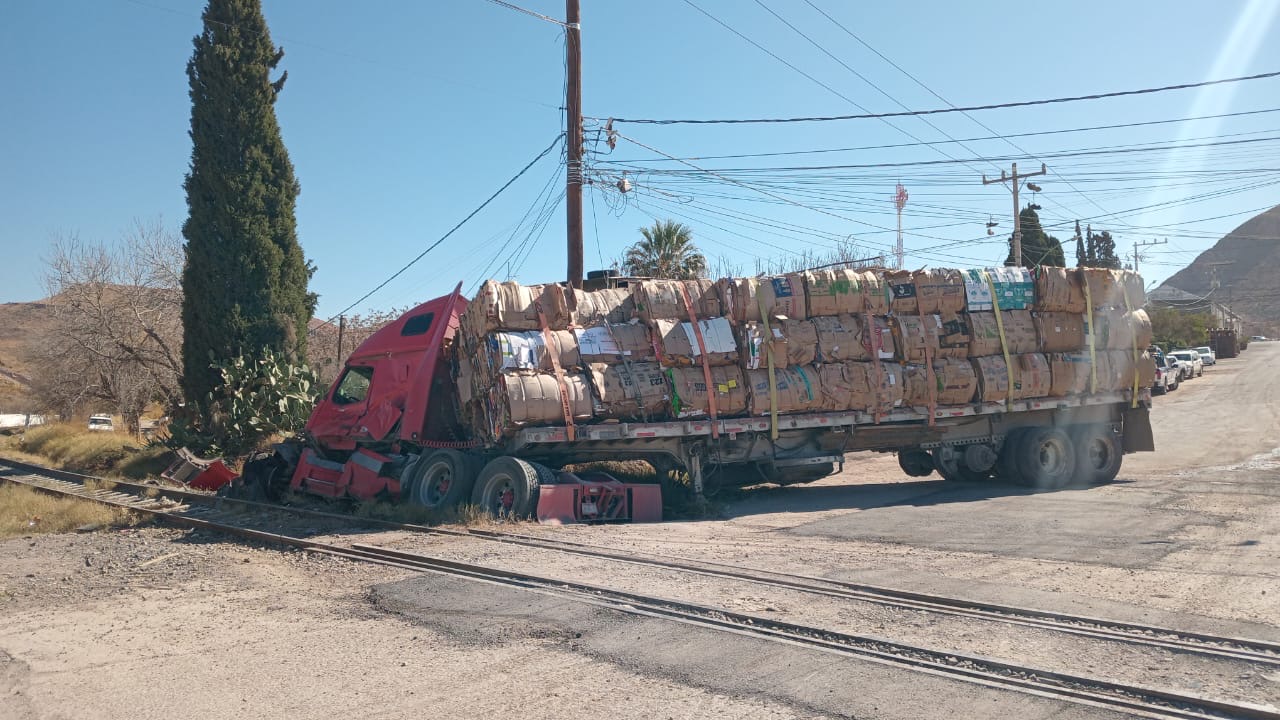 Un tráiler rojo de la marca Volvo intentó ganarle el paso al tren cuando ingresaba a la papelera cargado con cartón. El percance ocurrió alrededor de las 12:40 horas.