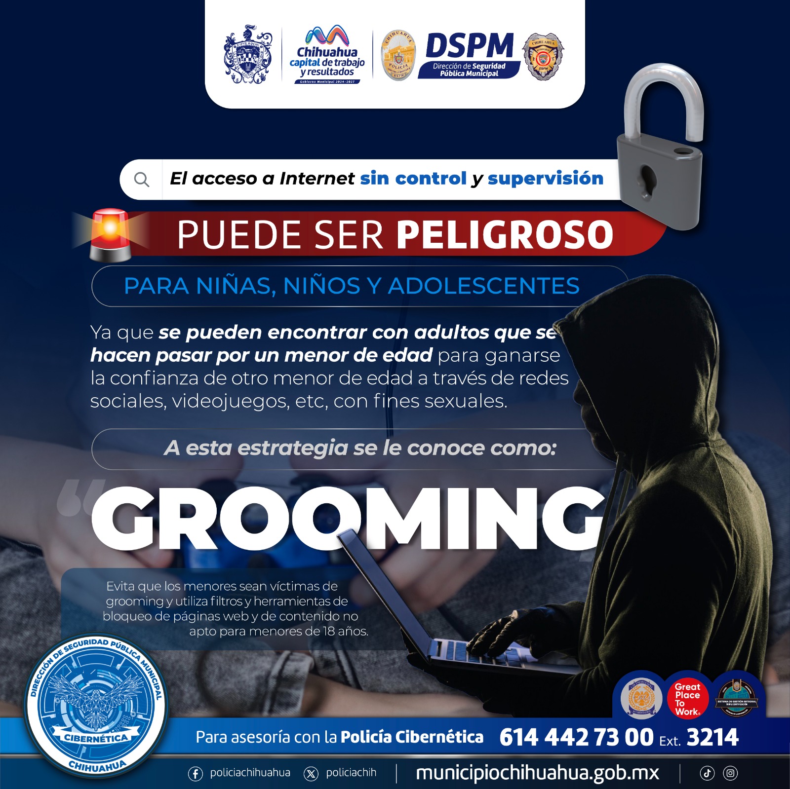 *_H. Ciudad de Chihuahua, Chih. A 22 de abril de 2025_*.- Con el objetivo de prevenir que niñas y niños caigan en redes de delincuentes virtuales, que buscan convertirlos en víctimas del delito de “grooming” o acoso sexual a través de Internet, el Gobierno Municipal alerta a los padres de familia para que permanezcan al tanto de su uso, especialmente durante la temporada vacacional, pues permanecen más tiempo en casa.