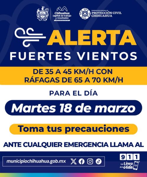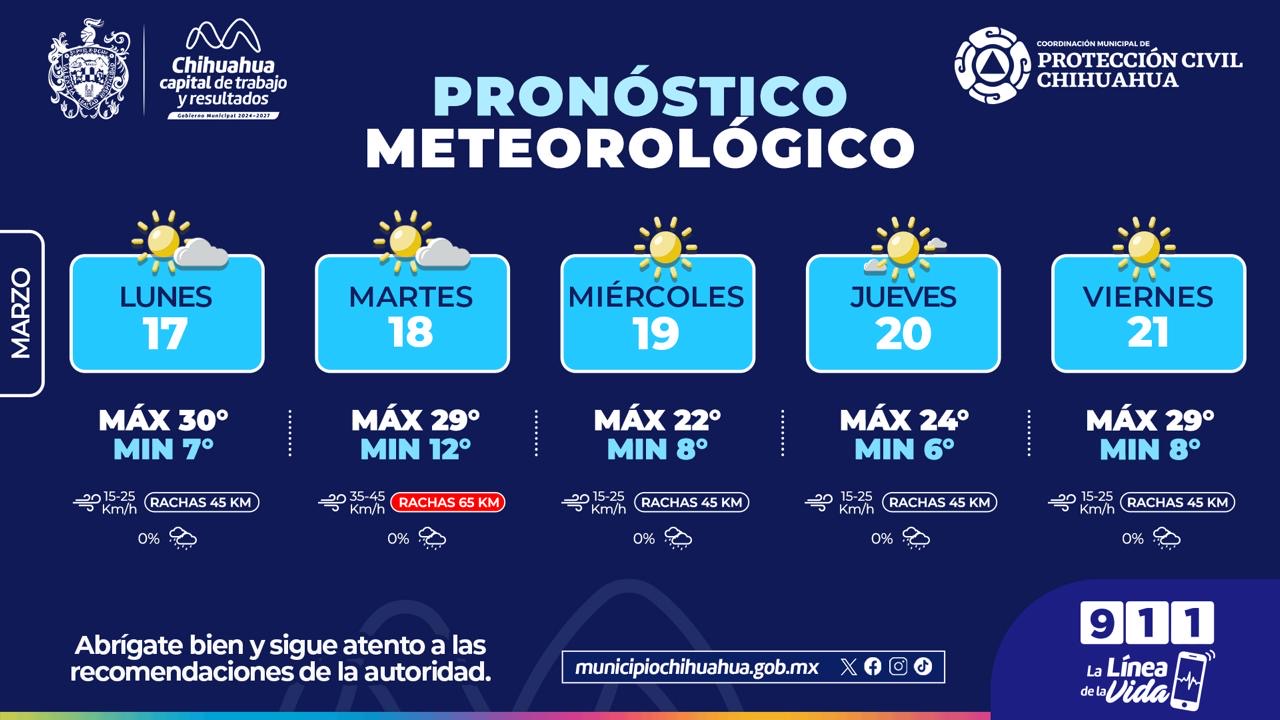 *_Chihuahua, Chih. A 17 de marzo de del 2025_*.- La Coordinación de Protección Civil Municipal, informa que para esta semana se pronostican temperaturas máximas de 30°C con mínimas de 6°C, así como presencia de rachas de viento de hasta 65 kilómetros por hora, especialmente el martes.