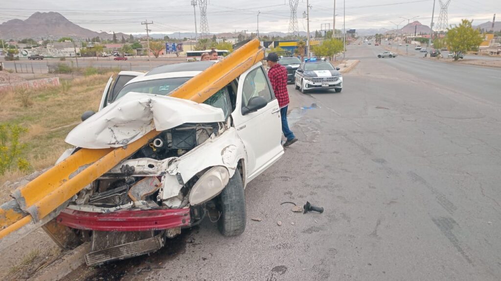 Chihuahua, Chih.– La tarde de este domingo se registró un fuerte accidente vial sobre el boulevar Fuentes Mares, en sentido de norte a sur, a la altura del periférico Francisco R. Almada, luego de que un conductor de edad avanzada perdiera el control de su vehículo y se impactara de forma violenta contra la valla de contención.