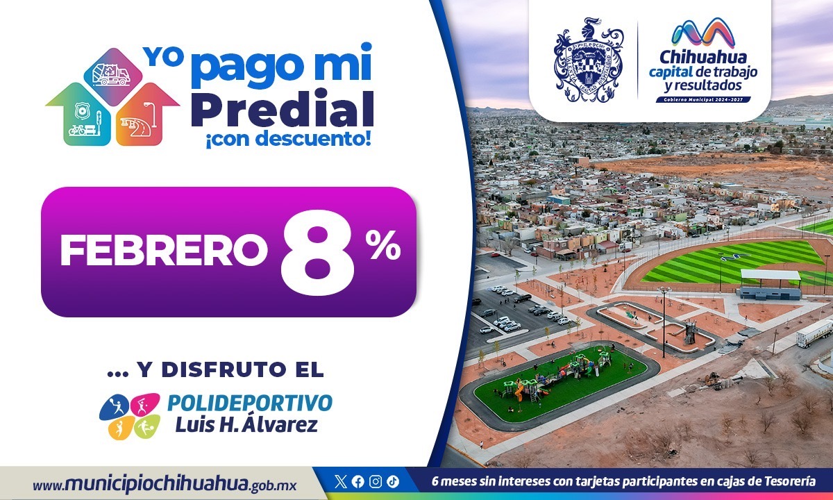 *_Chihuahua, Chih. A 24 de febrero de 2025._*- El Gobierno Municipal, a través de Tesorería, invita a aprovechar la última semana del descuento del 8 por ciento en el pago del Predial, el cual es para personas físicas y morales.