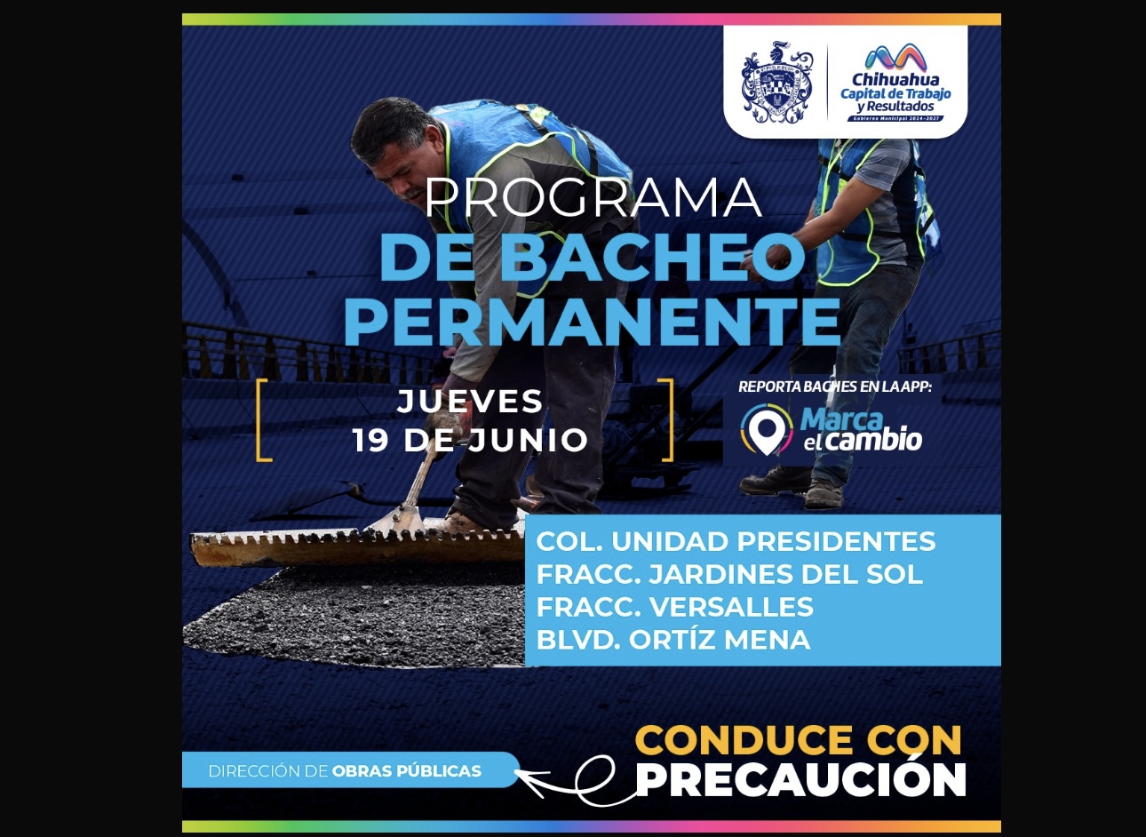 _*H. Ciudad de Chihuahua, Chih., A 19 de junio del 2025.-*_ El Gobierno Municipal, a través de la Dirección de Obras Públicas, trabajará con bacheo este 19 de junio en calles de la colonia Unidad Presidentes, así como en los Fraccionamientos Jardines del Sol, Versalles y en el boulevard Ortíz Mena.