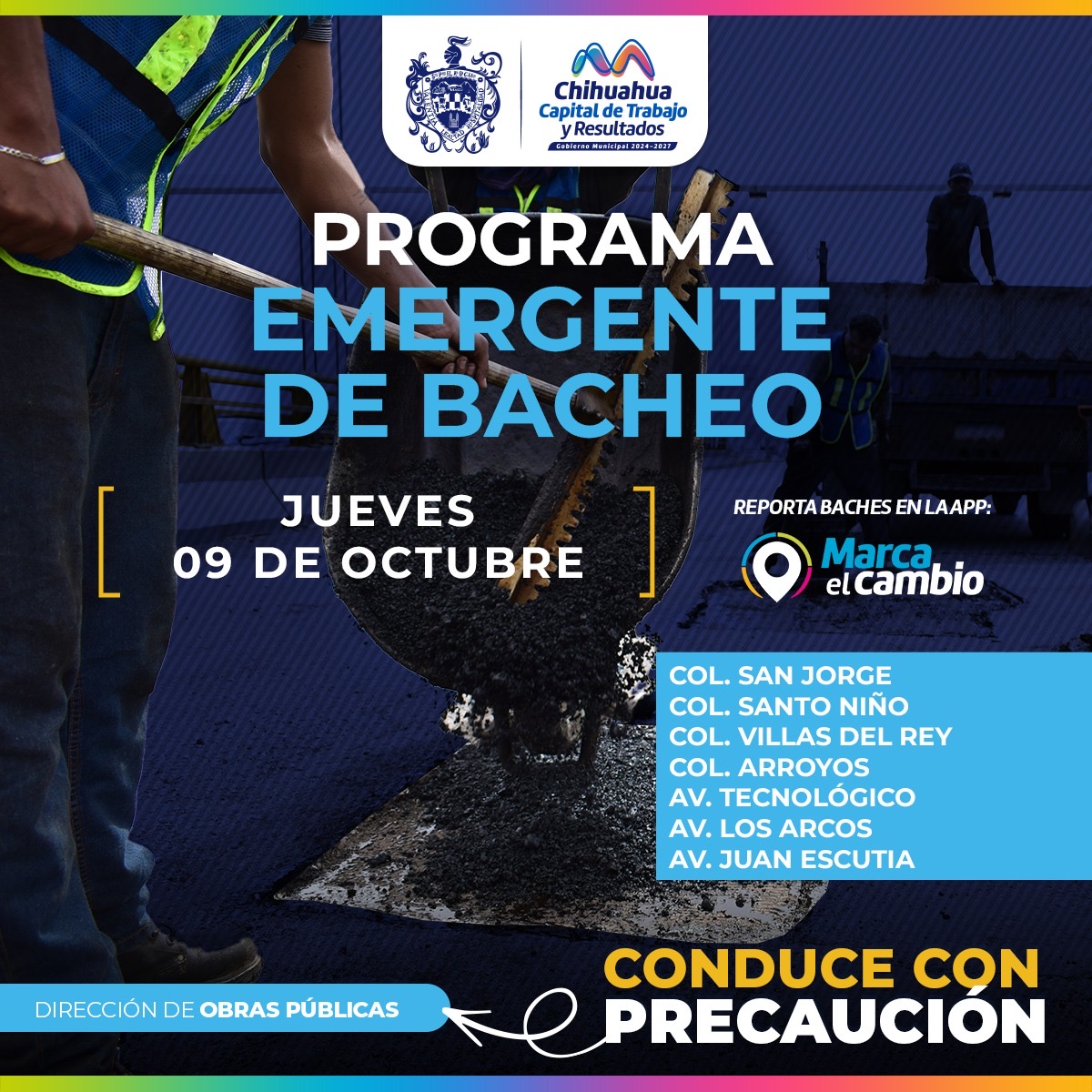 _*H. Ciudad de Chihuahua, Chih., a 9 de octubre del 2025.-*_ El Gobierno Municipal, a través de la Dirección de Obras Públicas, llevará a cabo trabajos de bacheo este 9 de octubre, mediante el programa emergente, en calles de las colonias: San Jorge, Santo Niño, Arroyos, Villas del Rey, así como en las avenidas Tecnológico, Los Arcos y Juan Escutia.