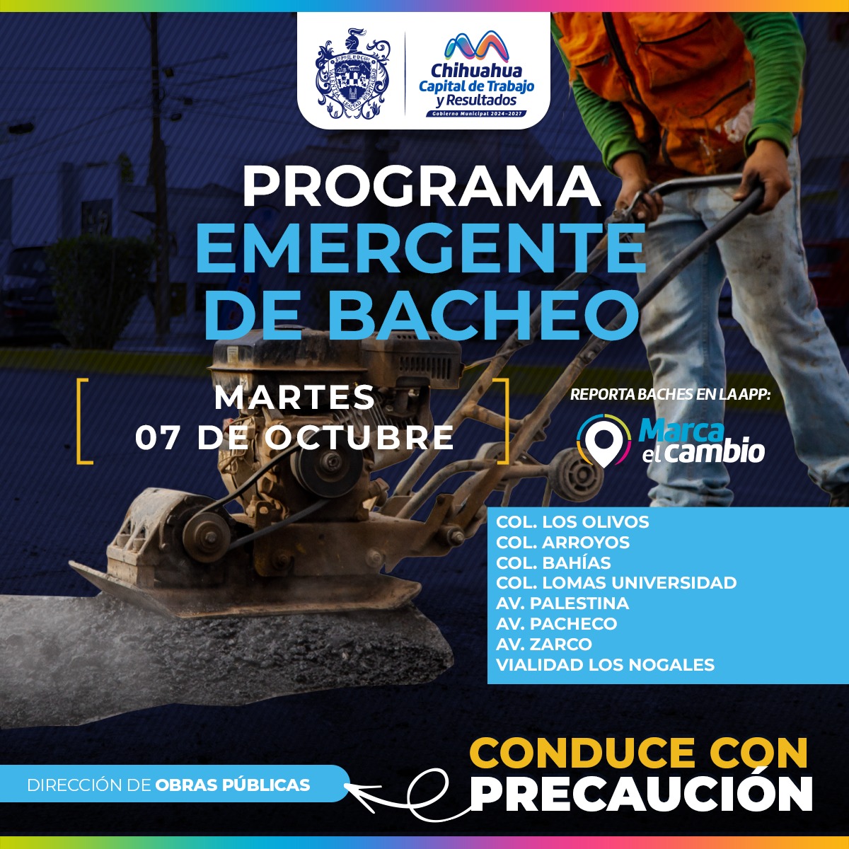 _*H. Ciudad de Chihuahua, Chih., a 7 de octubre del 2025.-*_ El Gobierno Municipal, a través de la Dirección de Obras Públicas, realizará trabajos de bacheo este 7 de octubre, mediante el programa emergente en calles de las colonias Los Olivos, Arroyos, Bahías, Lomas Universidad, así como en las avenidas Palestina, Pacheco, Zarco y en la Vialidad Los Nogales.