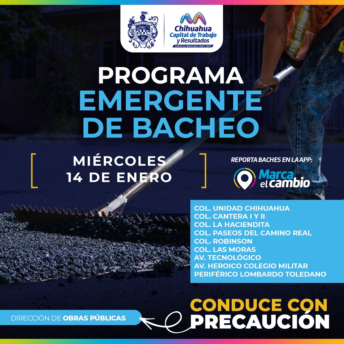 _*H. Ciudad de Chihuahua, Chih., a 14 de enero del 2026.-*_ El Gobierno Municipal, a través de la Dirección de Obras Públicas, realizará trabajos de bacheo este miércoles 14 de enero mediante el programa emergente en calles de las colonias: Unidad Chihuahua, Cantera I y II, La Haciendita, Paseos de Camino Real, Robinson y Las Moras, así como en las avenidas Tecnológico, Heroico Colegio Militar y periférico Lombardo Toledano.