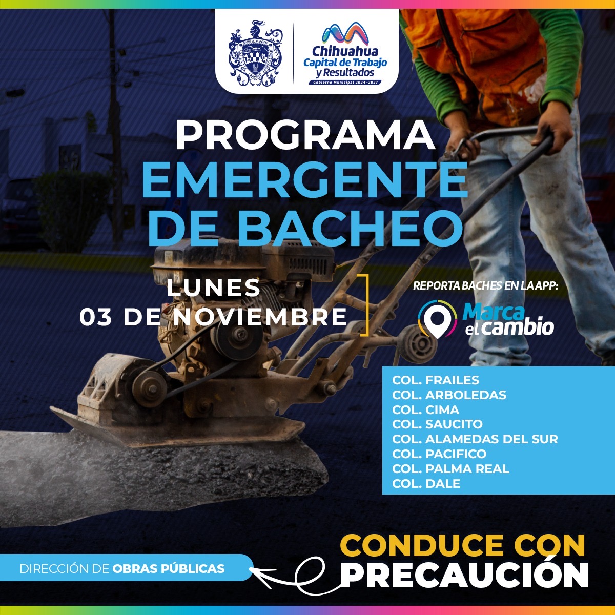 _*H. Ciudad de Chihuahua, Chih., a 3 de noviembre del 2025.-*_ El Gobierno Municipal, a través de la Dirección de Obras Públicas, bacheará este 3 de noviembre, mediante el programa emergente, en calles de las colonias Cima, Los Frailes, Saucito, Arboledas, Alamedas del Sur, Pacifico, Palma Real y Dale.