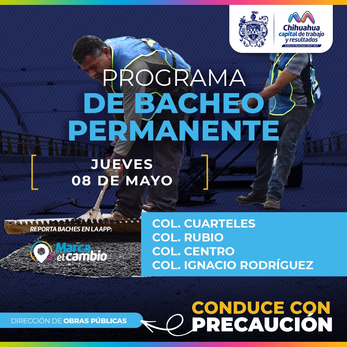 _*H. Ciudad de Chihuahua, Chih., a 8 de mayo del 2025.-*_ Para mantener las calles de la capital en óptimas condiciones, el Gobierno Municipal a través de la Dirección de Obras Públicas, realizará bacheo este 8 de mayo en las colonias Cuarteles, Rubio, Centro e Ignacio Rodríguez.