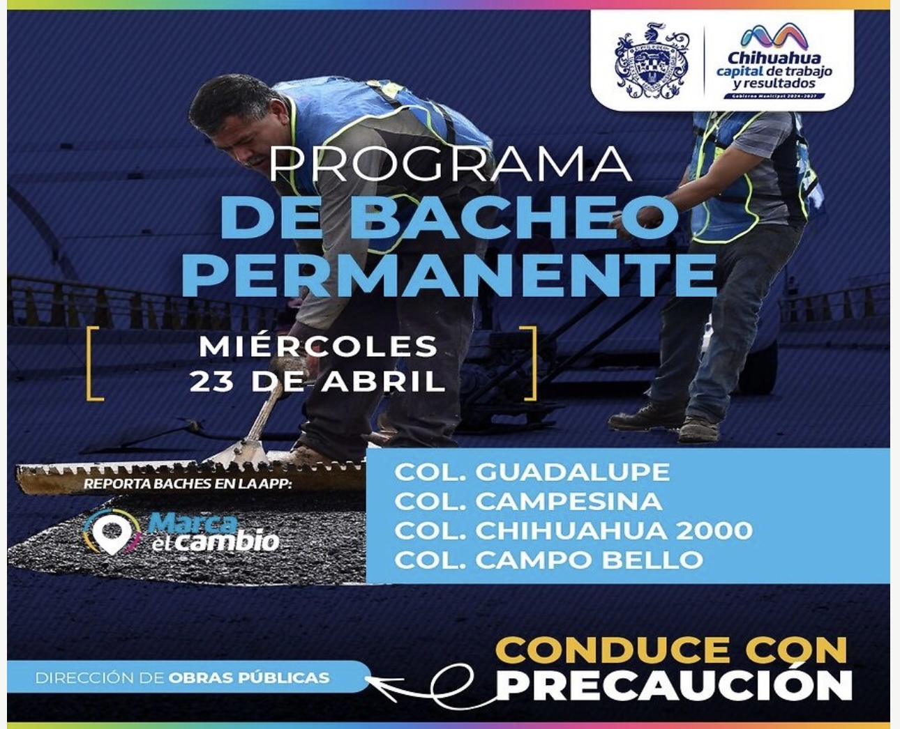 *H. Ciudad de Chihuahua, Chih., a 23 de abril del 2025.-*_ El Gobierno Municipal, a través de la Dirección de Obras Públicas, bacheará este 23 de abril en calles de las colonias Guadalupe, Campesina, Chihuahua 2000 y Campo Bello.